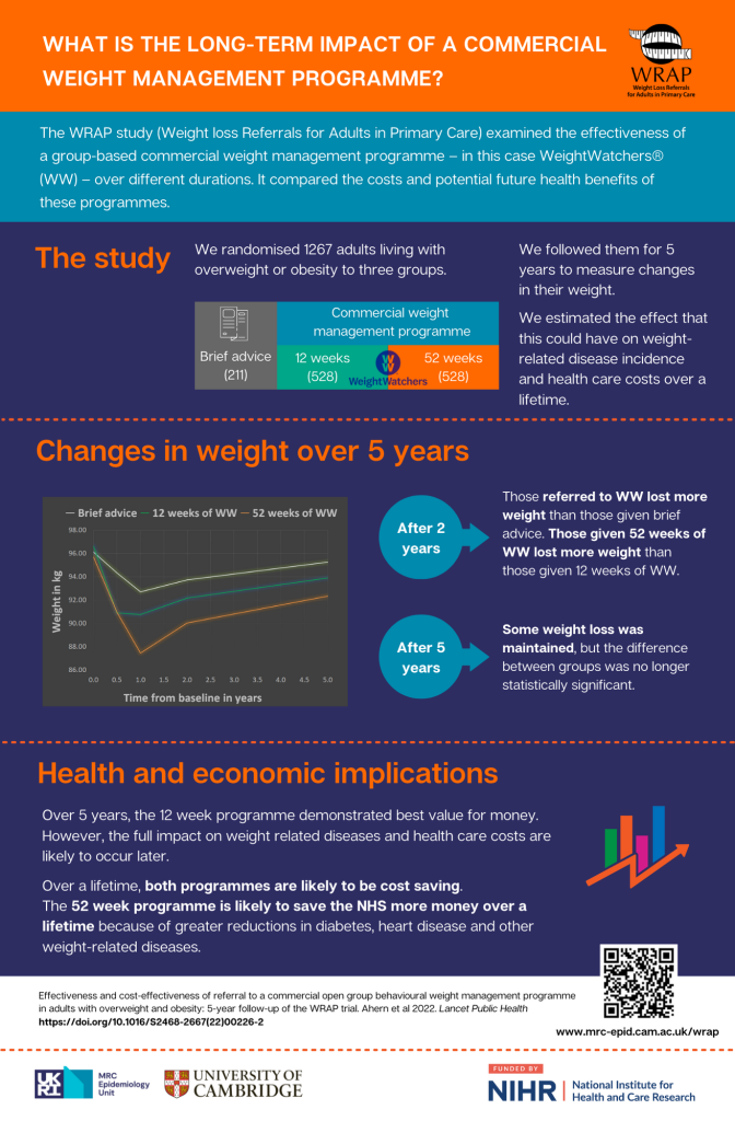 - Full paper: Effectiveness and cost-effectiveness of referral to a commercial open group behavioural weight management programme in adults with overweight and obesity: 5-year follow-up of the WRAP trial. Ahern et al 2022. Lancet Public Health DOI: 10.1016/S2468-2667(22)00226-2